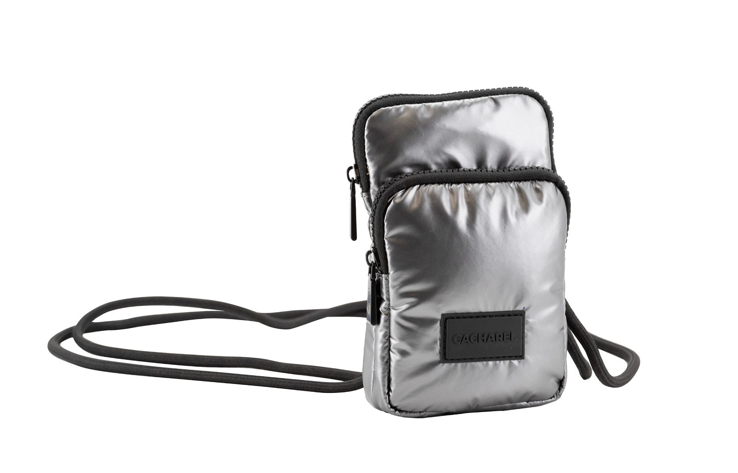 Minibolso de nylon en color plomo con el logotipo CACHAREL en goma. Nuevo diseño con bolsillo exterior, cierre de cremallera y bandolera de cordón ajustable. Bolsillo de rejilla en la parte trasera y triple tarjetero interior.