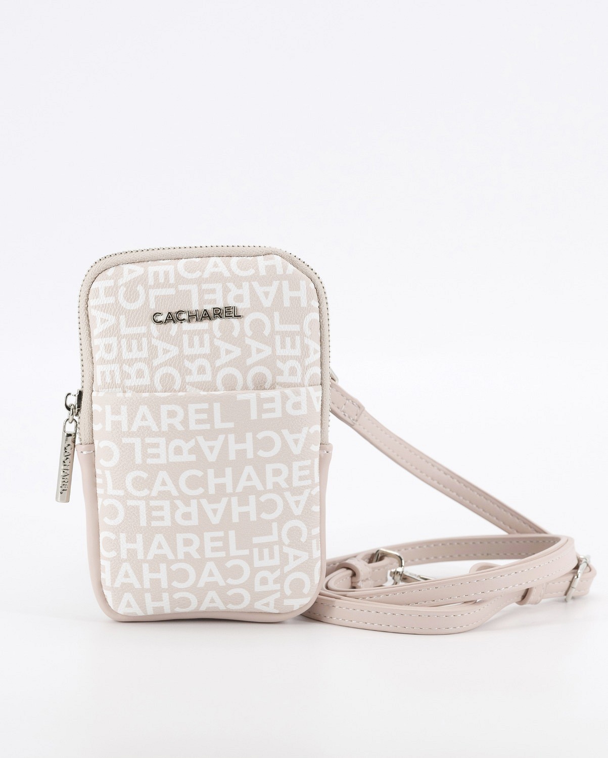 Minibolso para móvil con el nuevo print CACHAREL en color Nude. Bolsillo exterior y cierre de cremallera. Interior con compartimentos para tarjetas. Asa bandolera con mosquetones para poderse quitar y utilizar como funda para móvil. Exterior personalizado con logo metálico.