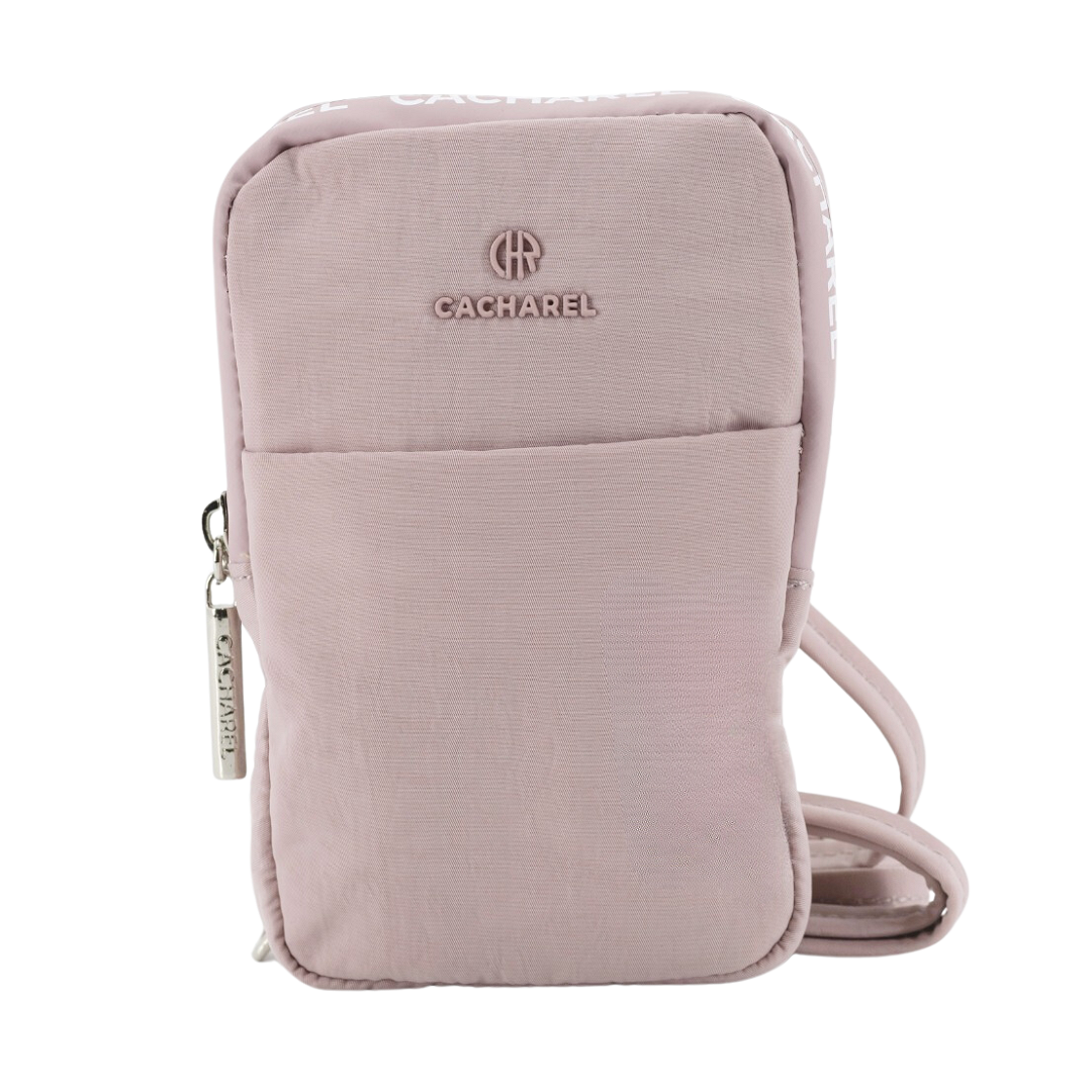 Minibolso para móvil color nude. Bolsillo exterior y cierre de cremallera. Interior con compartimentos para tarjetas. Asa bandolera con mosquetones para poderse quitar y utilizar como funda para móvil. Exterior personalizado con logo metálico al tono y cremallera de goma con logo impreso.