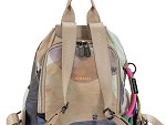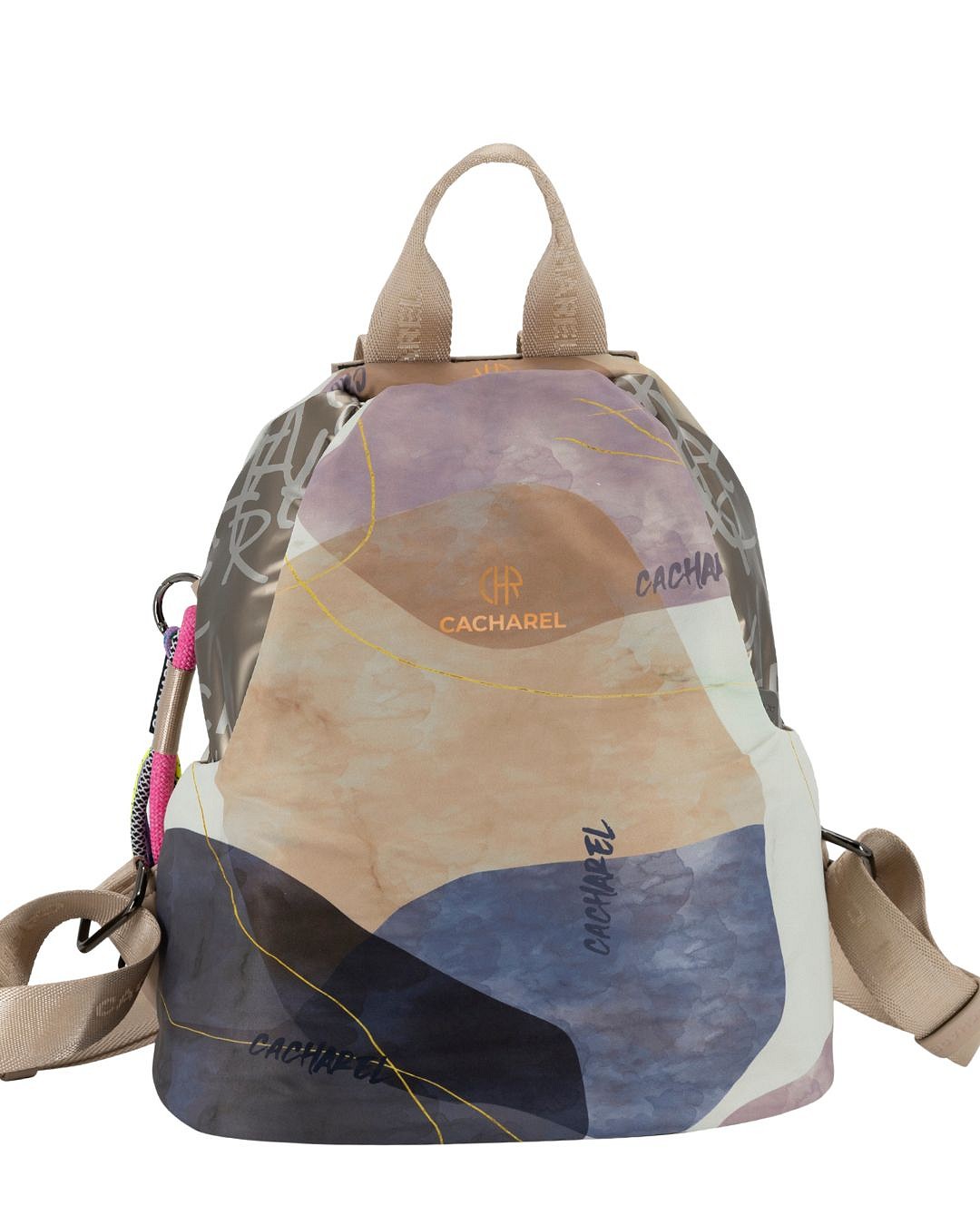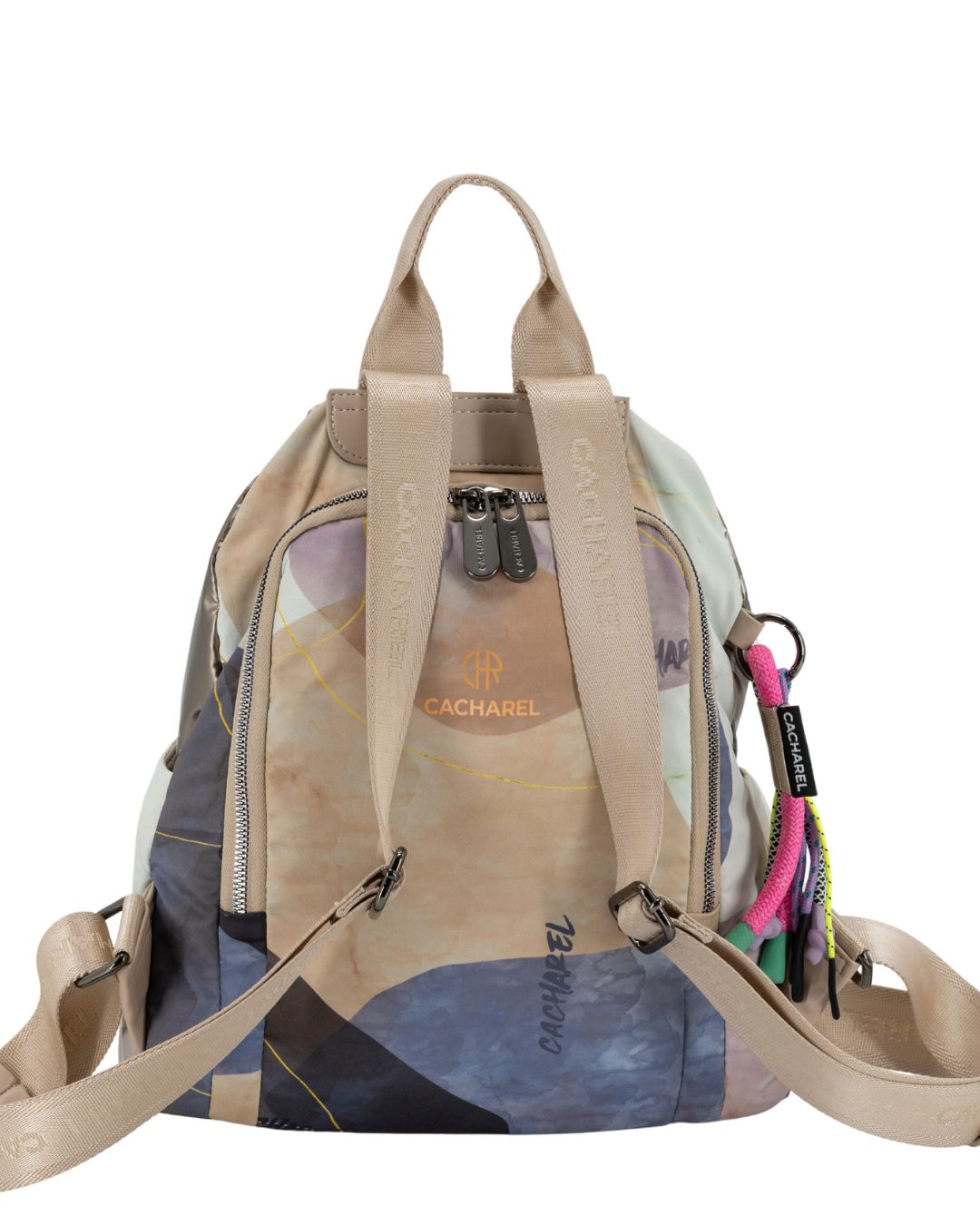 Mochila antirrobo Cacharel con diseño moderno y estampado abstracto en tonos suaves.