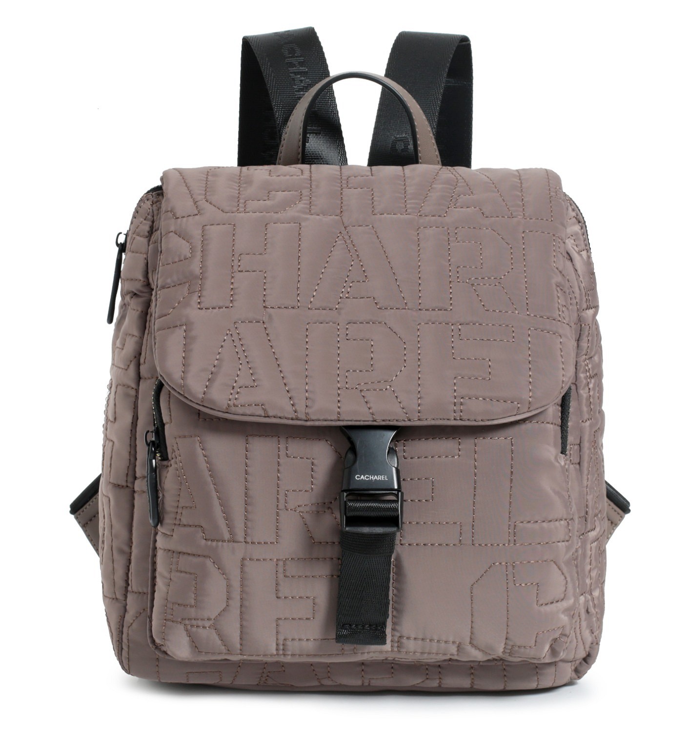 Mochila de nylon con bordado Cacharel en color taupe. Bolsillo delantero con cremallera y bolsillo trasero. Espaciosa y con diseño. Cierre con cremallera. Tiradores personalizados y varios bolsillos interiores.