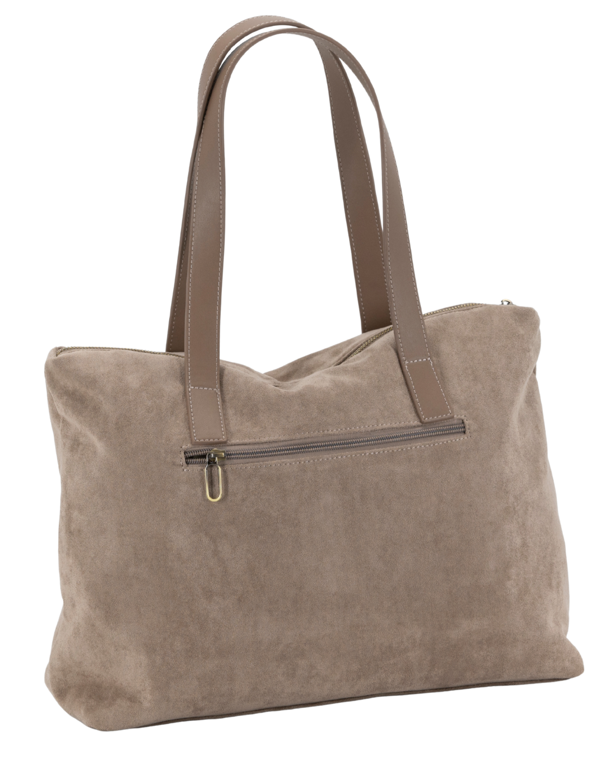 Maxi shopper con material en tendencia, efecto ante. Asas en contraste, cierre con cremallera para mayor seguridad. El logo de CACHAREL en metal de color old gold en la parte delantera. Bolsillo parte delantera y trasera.