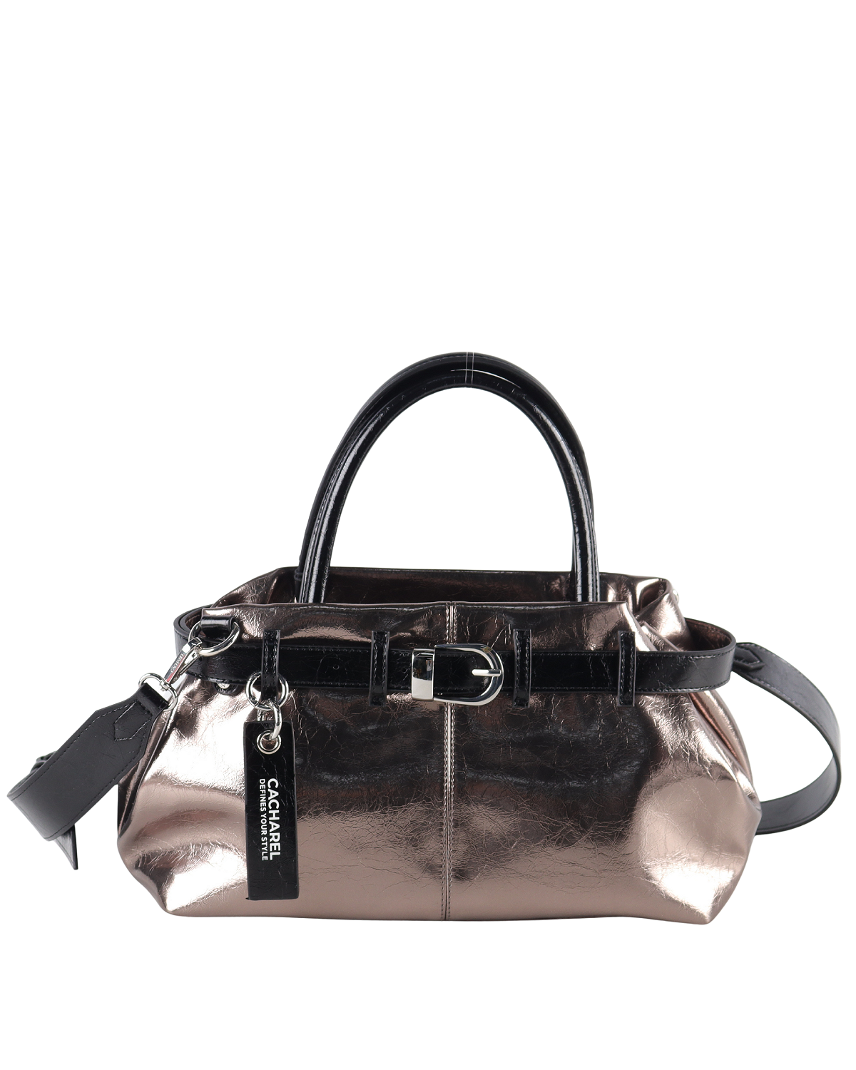 Bolso sofisticado por su combinación acero y negro, elegancia estética y versatilidad por su correa estilo cinturón, elemento icónico en la moda actual. Asa bandolera regulable, charm CACHAREL.