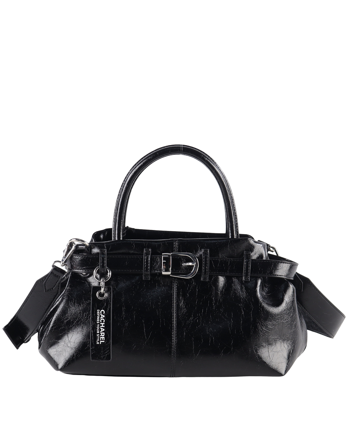 Bolso sofisticado por su combinación en elegancia estética y versatilidad por su correa estilo cinturón, elemento icónico en la moda actual. Asa bandolera regulable, charm CACHAREL.