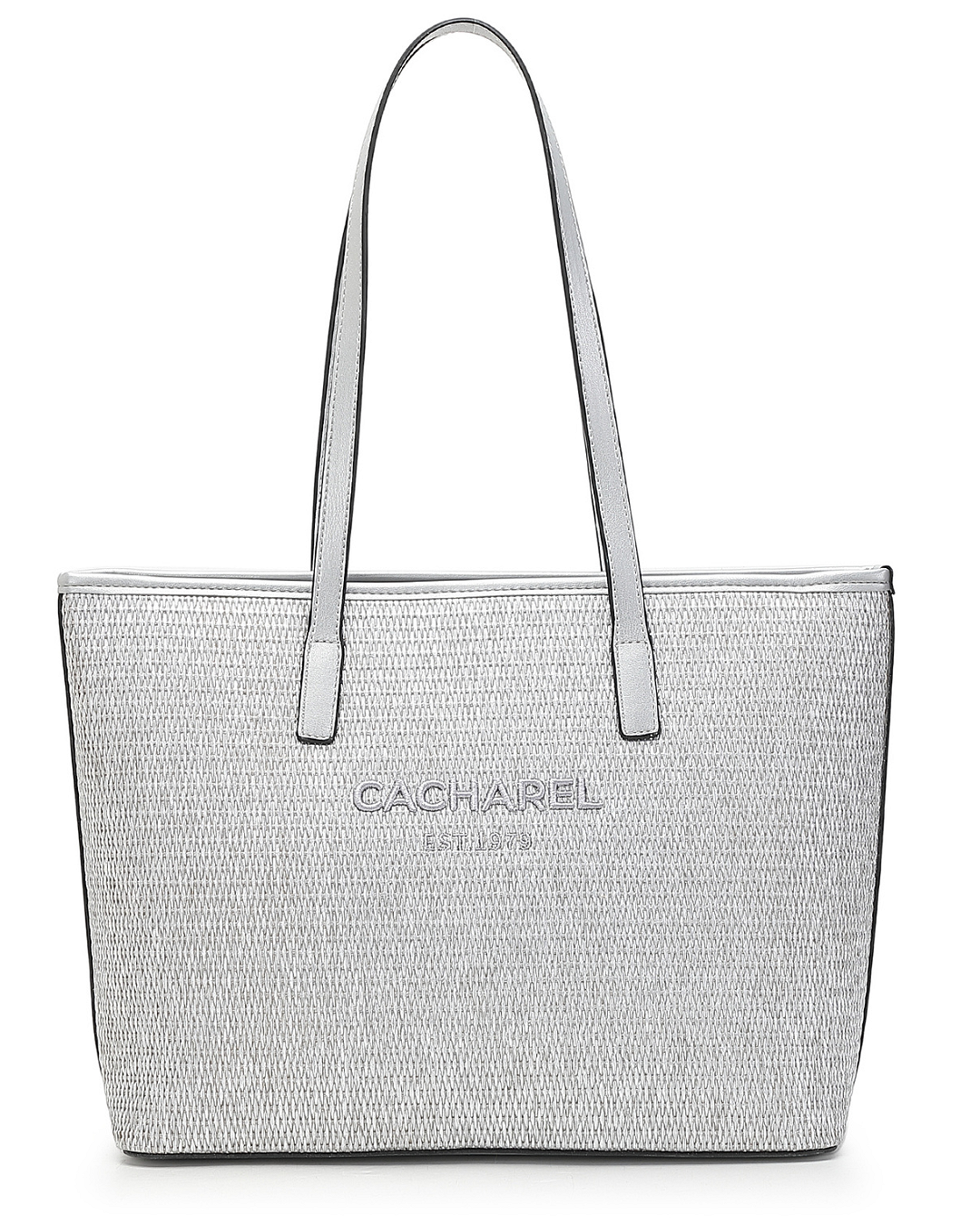 Shopper elaborado en una comibinación de materiales veganos impresos con un tono plata con el logo bordado en la parte delantera. Amplio con varios compartimentos. Cierre con cremallera y varios bolsillos interiores.